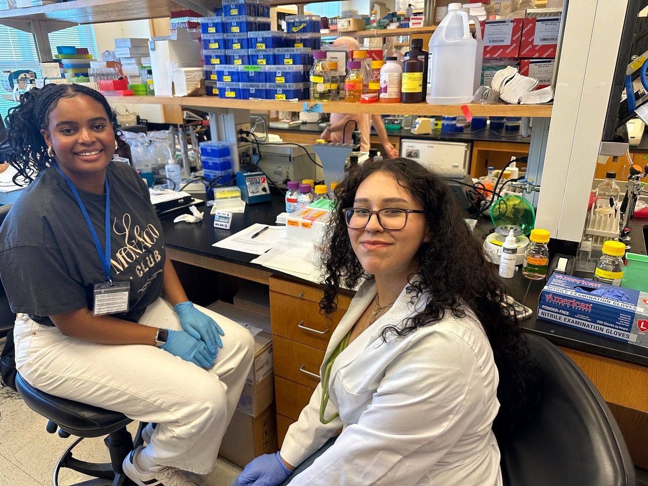 Braelyn McClain and Keylyn Bonilla-Fuentes in the laboratory — they produced a podcast with Yvonne Trejo Balderas