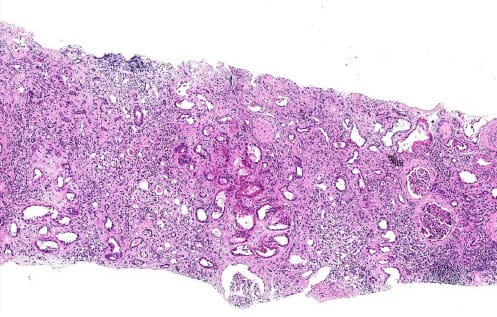 Kidney biopsy with marked interstitial fibrosis and tubular atrophy (IFTA)